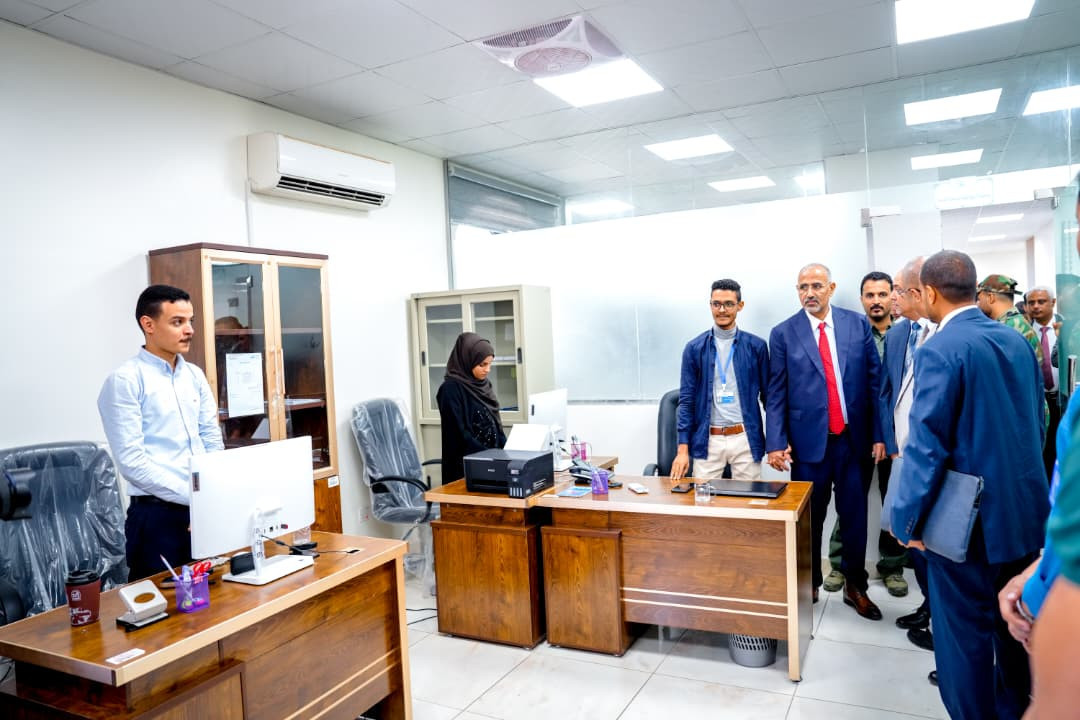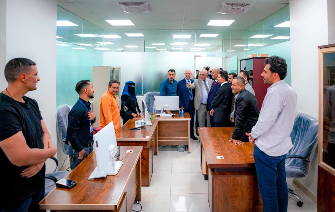 Upon arrival at the ministry's main building, President Al-Zubaidi was received by the Acting Minister of MCIT, who is also the Minister of Planning and International Cooperation, Dr. Wa'ed Badhib, along with Eng. Wael Tarmoum, Chairman of the Public Telecommunications Corporation; Eng. Abdulsalam Al-Salafi, CEO of "TeleYemen"; and Eng. Mansour Al-Walidi, CEO of "AdenNet."