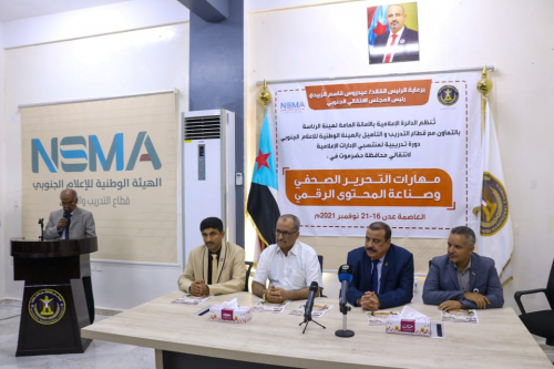 Major General Ahmed Saeed Bin Brik, Acting President of the Southern Transitional Council, Chairman of the National Assembly, and with him, Mr. Fadl Mohammad Al-Jaadi, Deputy Secretary-General of the General Secretariat of the Presidency of the Council, on Tuesday, inaugurated in the capital, Aden, a training course of “Press editing skills and creating digital content”, organized by the Media Information Department in the Secretariat of the Presidency of the Transitional Council, in cooperation with the Training and Rehabilitation Sector of the National Southern Media Authority, for members of media information departments in the executive bodies of the local leaderships of the Transitional Council in Hadhramout governorate.