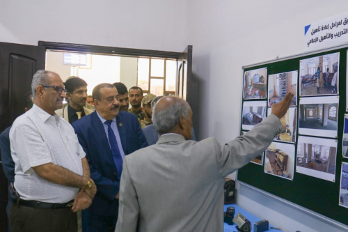 In the same context, Major General Ahmed Bin Brik, along with Mr. Fadl Al-Jaadi, and Mr. Mukhtar Al-Yafei, and Dr. Bassem Mansour, after the inauguration of the training course, toured the Media Training Center, and got acquainted from Dr. Abdullah Al-How about the various sections of the center and the most important activities and services provided by the Training Center for the southern media.
