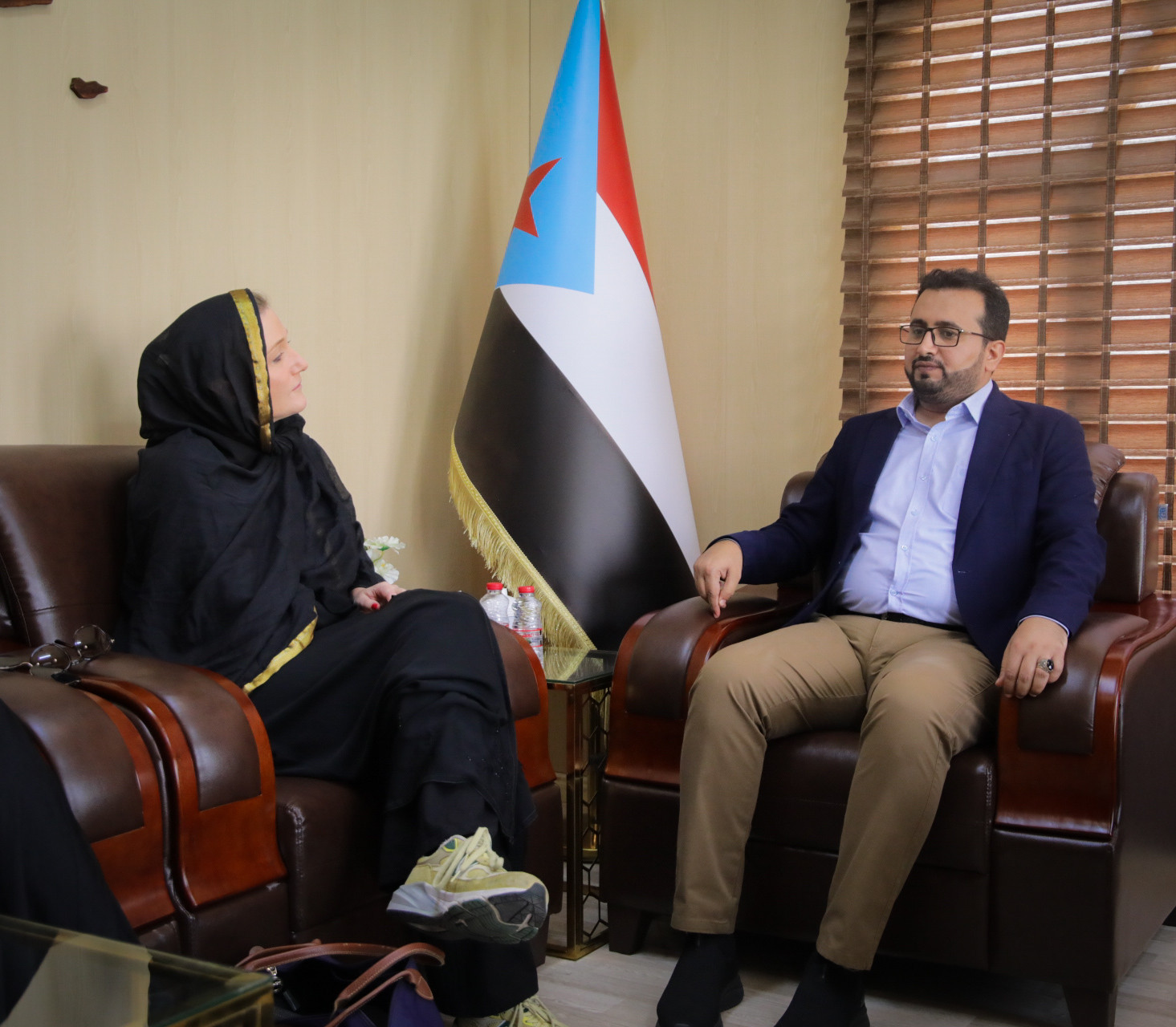 Mr. Salem Thabet Al-Awlaqi, head of the National Southern Media Authority (NSMA), assisting the Presidium of the Southern Transitional Council (STC) and the official spokesman of the STC, received on Wednesday in his office the Netherlands media delegation from NOS Radio and Television, including journalist Dessie Anna Elizabeth and photographer Ademi Van Rijn.
