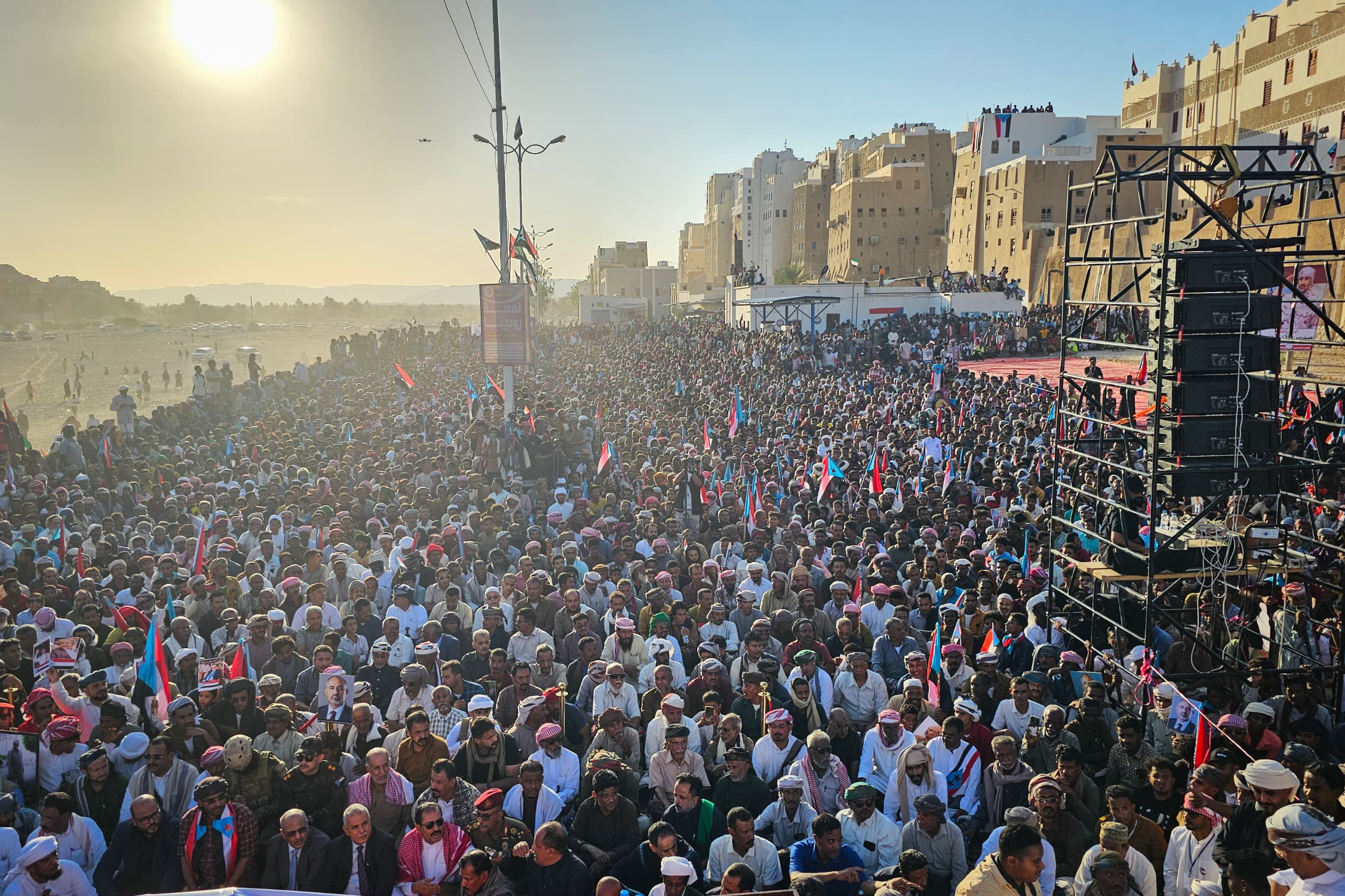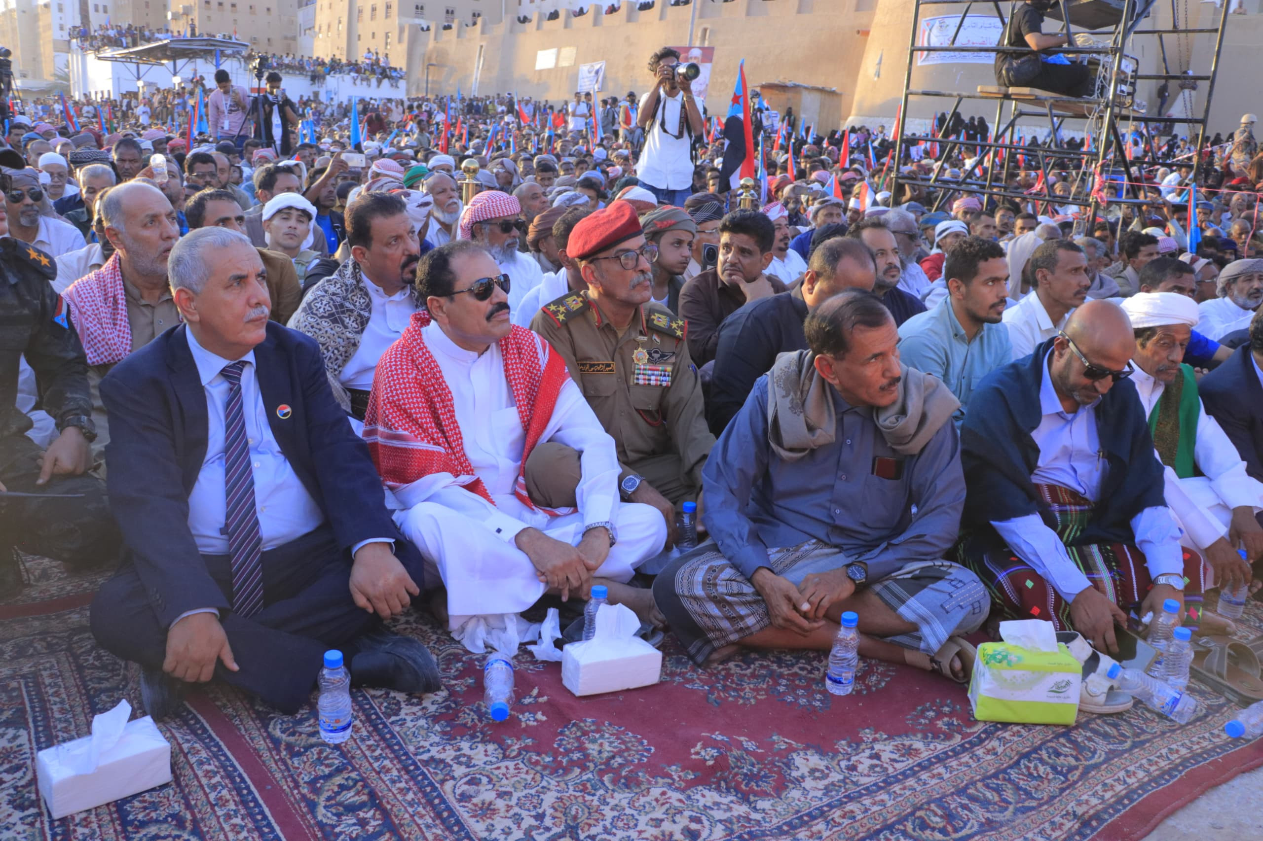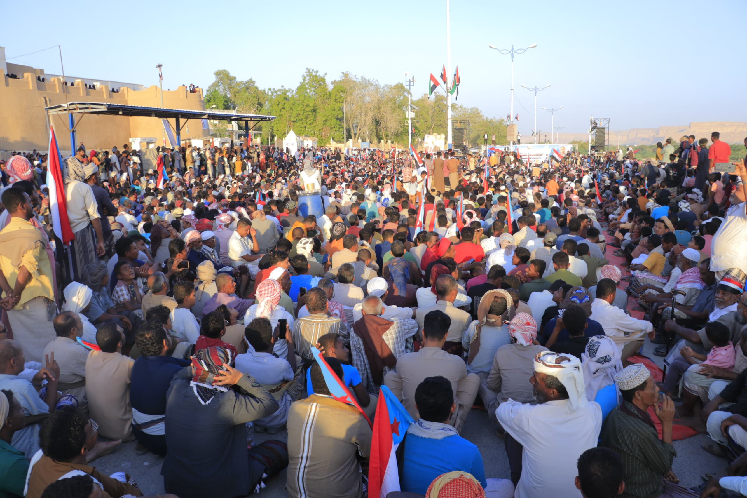 The event, which is one of the largest in the city's history, with the participation of military leaders and political and social figures, witnessed crowds of participants from various governorates of the South in general and the districts of Hadhramaut in particular that flowed since the early morning hours towards the event square in the heart of Shibam, as the city was adorned with flags of the South and photos of President Aidarous Al-Zubaidi, in a scene that reflected the depth of national belonging and the spirit of popular rallying around the project of restoring the southern state of the South.
