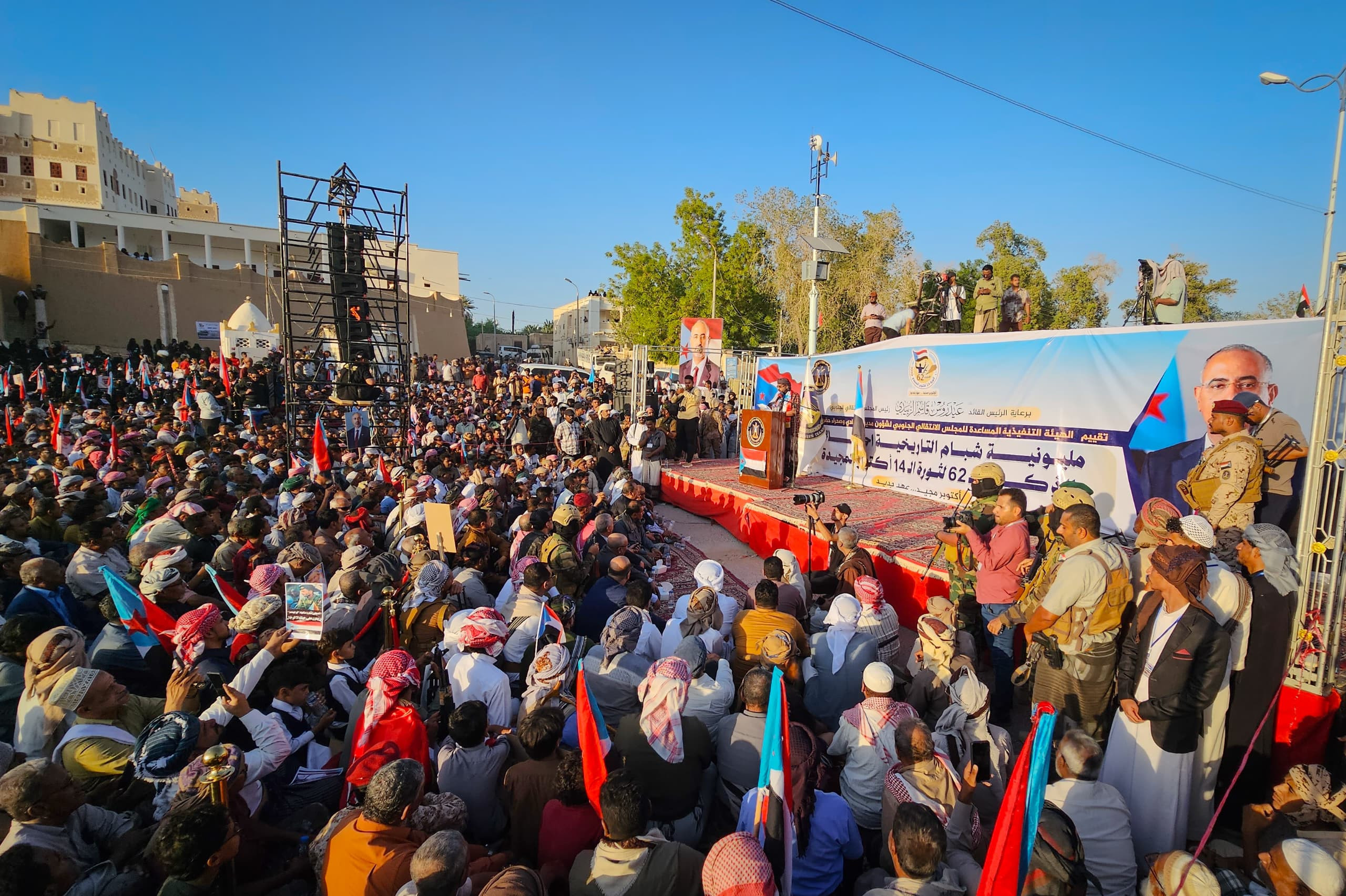 Al-Zubaidi said, "From here, from Shibam of civilization and history, we celebrate today the 62nd anniversary of the South's immortal revolution. Our celebration constitutes a new station for reconciliation, tolerance, and sublimation among the people of Hadhramaut Valley and its desert, and a new page based on fraternity, harmony, and cooperation. This land has united us since time immemorial, and it is our duty as Hadhramis to rise above petty disputes and stay away from causes of division and disagreement."