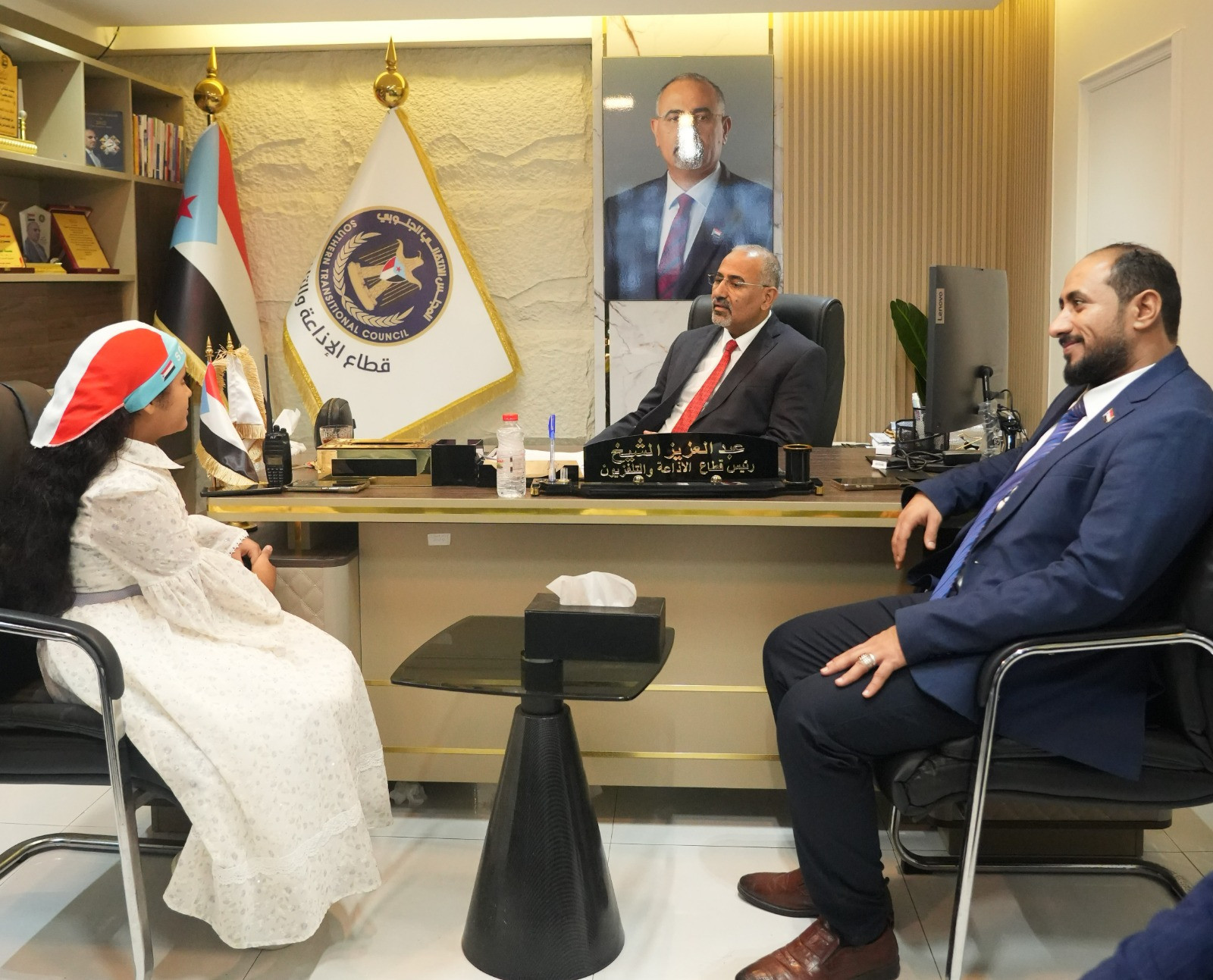 President Al-Zubaidi lauded Munira's enthusiasm, courage, and keenness to attend the open sit-in square to express her aspirations for a bright future in the Southern homeland that is characterised by justice, dignity, and decent living, and stated that her spontaneous and sincere appearance reflects the sterling will of an entire generation looking forward to a better tomorrow.